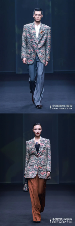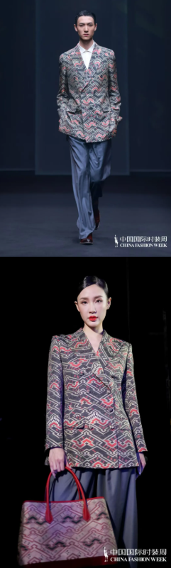 周锦携团队将山东省考古研究院在淄博出土的齐国周代的锦复制出来,从缫丝到植物染色再到复制纹样与织造,经过三年多才复制出了周代青、赤、黄、白、黑于一体的五色锦,对其纹样、色彩、织造技术做了多元呈现。本次大秀就是中国最早的锦齐鲁锦的一次华丽亮相,面料上将北斗七星、万寿纹以及山川日月集中呈现。虽然复制难度极高,但却展现了山东织造、鲁锦产业链的高品质。
