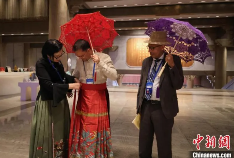 尤为引人注目的是山东省服装设计协会带来的华服展区:以马面裙为代表的传统服饰工艺,结合鲁绣技艺的现代设计,直观呈现了中国传统服饰美学的当代转化。多位观展的希方人士评价:这些展品不仅是文物,更是“方法论”它们揭示了不同文明如何通过物质载体实现精神对话。