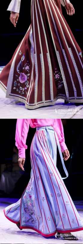 第四篇章“鸣谦贞吉”源于《易经》中的乾卦,提醒人们要葆有“谦受益、满招损”的智慧。对马面裙的阑干之华美、阑干之秩序、数字之智慧、植物之护佑等等深度挖掘和融合,让文创的魅力给予更多年轻人爱上中国华裳的理由,让中国特色的马面裙成为影响国际的时尚单品。