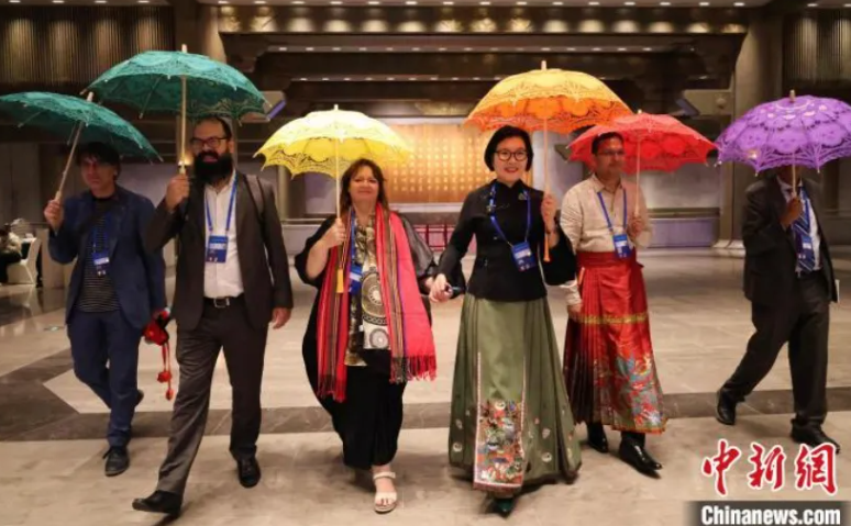 7月9日,在山东曲阜尼山圣境,国际知名设计师、山东省服装设计协会会长周锦(右三)与外国嘉宾共同展示鲁绣花边伞和马面裙。中新社记者 赵晓 摄