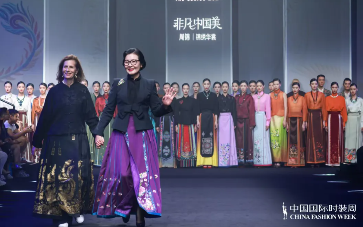 (周锦,山东省服装设计协会会长,北京服装学院、中央戏剧学院、北京电影学院客座教授,中国十佳时装设计师,中国纺织非遗推广大使,非遗衣线绣马面裙制作技艺项目代表性传承人,鲁锦高水平质量的发展产业联盟产业中心主任。出版《中国古代服饰文献图鉴》、《锦绣罗裙-传世马面裙鉴赏》等多本国家重点图书。)