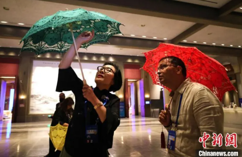 7月9日,在山东曲阜尼山圣境,周锦(左)向外国嘉宾介绍鲁绣花边伞的工艺。中新社记者 赵晓 摄