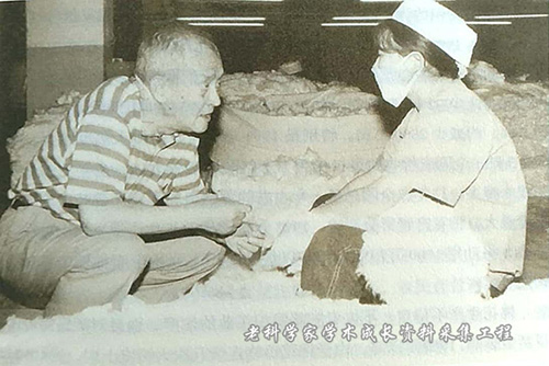20世纪60年代,梳棉机投产初期,梅自强与团队研究设施安装(来源:中国纺织科学研究院有限公司)